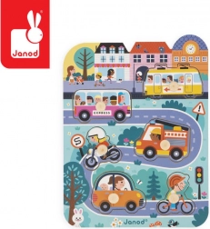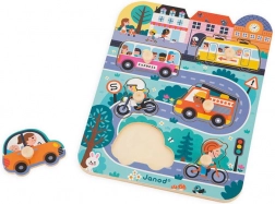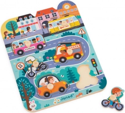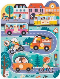 A Janod márkájú fa puzzle A városban könnyű és szórakoztató módot kínál arra, hogy a gyerekek megismerkedhessenek a különféle közlekedési eszközökkel. A készlet 7 darabot tartalmaz: villamos, busz, motorbicikli, kerékpár, személyautó és tűzoltóautó, mindez egy fából készült táblán egy városi jelenettel.