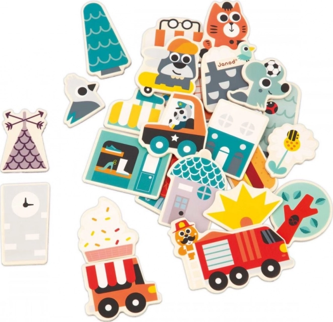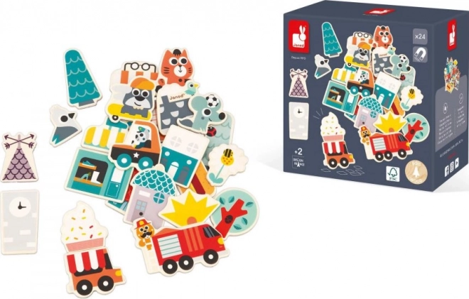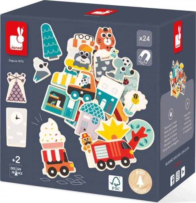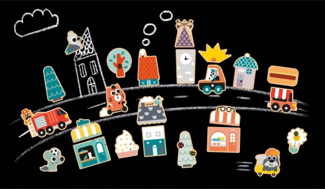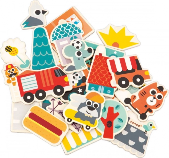 Ezzel a 24 darabos fa mágneskészlettel minden mágneses felületen építhetsz! A gyerek mágnesek között a rolleren és a gördeszkán kívül járműves mágnesek is vannak (tűzoltóautó, rendőrautó, ételárusító autó), valamint elemek, amelyekből üzletek és házak állíthatók össze, hogy az élettel teli, vidám állatok által benépesített város virágozzon. A mágnesek szabadon keverhetők, így számtalan különböző kombináció hozható létre.