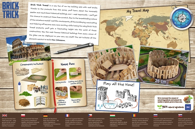 Építse meg az ikonikus Kolosszeumot természetes anyagokból a TREFL BRICK TRICK Travel építőkészlettel. A szett több mint 450 agyagtéglát, fa léceket és dekorációkat tartalmaz a valósághű végeredményért. A vízben oldódó ragasztónak köszönhetően újra és újra építhet, fejlesztheti kézügyességét, fantáziáját és koncentrációját, és alkothat útmutató alapján vagy saját elképzelése szerint.