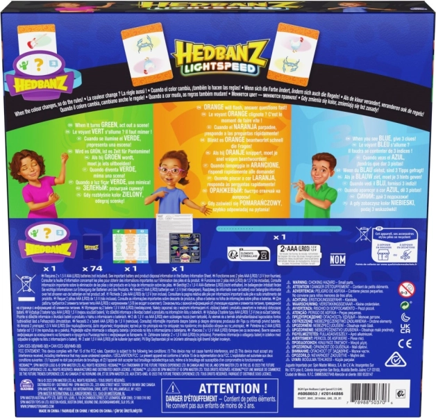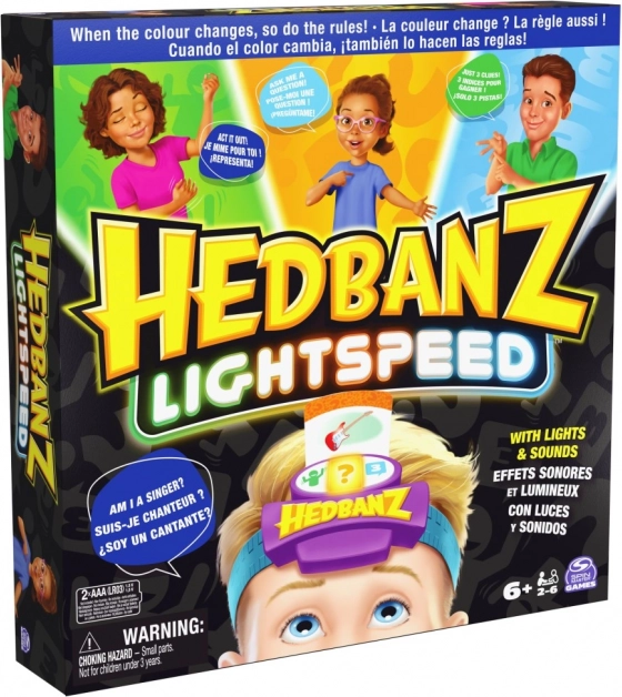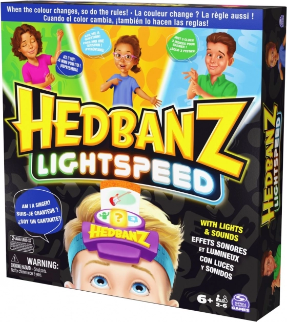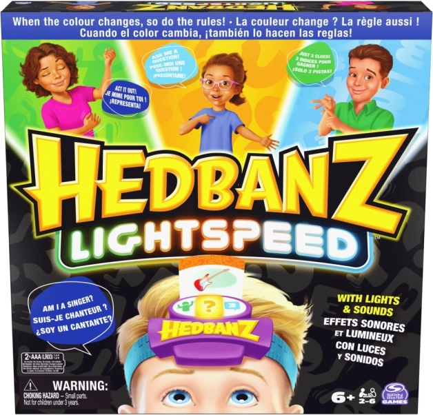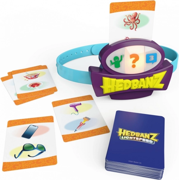 Élvezze a Hedbanz Lightspeed izgalmas játékát, ahol a szabályok folyamatosan változnak a dinamikus három színű elektronikus fejpántnak köszönhetően. Játszon el egy jelenetet, válaszoljon a fény sebességével, vagy használjon három tippet attól függően, hogy éppen milyen színt mutat a fejpánt.