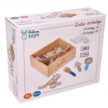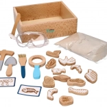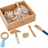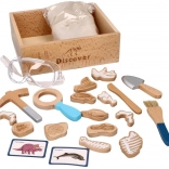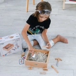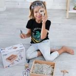 A csomag mindent tartalmaz, amire egy kis paleontológusnak szüksége lehet: a felfedező ládikától kezdve az eszközökön (kalapács, nagyító, kés, ecset, lapát) át egészen a dinoszauruszcsontokig, halakig és kövületekig. Két kétoldalas kártya segít a kiásott leletek könnyű azonosításában. A homok az EU-ban készült és megfelel a biztonsági előírásoknak.