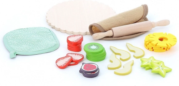Ez a minőségi, fából és textilből készült szett bármely gyerekkonyhát apró cukrászdává varázsol. A gyerekek gyakorolják a finommotorikát, a szem–kéz koordinációt és a kreativitást a torta díszítése közben a színes gyümölcsszeletekkel. Remek közös program testvérekkel és barátokkal is.
