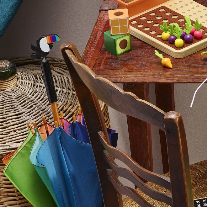 Az egyedi, tukán alakú gomb egyediséget kölcsönöz az esernyőnek, és a gyerekeket örömteli használatra ösztönzi.