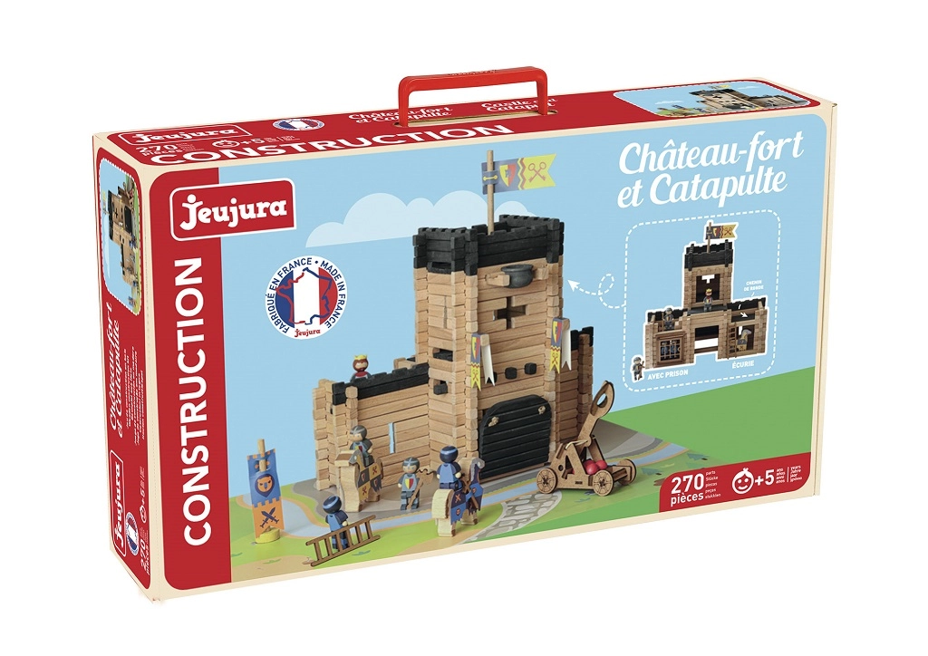 Építsd meg saját középkori királyságodat a JEUJURA fa építőkészlettel. A 270 darabból álló, tömör fából készült készlet segítségével a gyerekek megalkothatnak egy nagy várat felvonóhíddal, börtönnel, őrsétányokkal, zászlókkal és működő katapulttal. Hagyományos francia gyártás, vízbázisú, biztonságos festékek és praktikus karton bőröndös csomagolás – tökéletes ajándék 5 éves kortól kis építőknek.