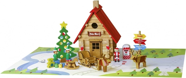 - Karácsonyi jelenet: Mikulás, manók, rénszarvasfogattal húzott szán, postaláda, irányjelző és ajándékokkal díszített fa