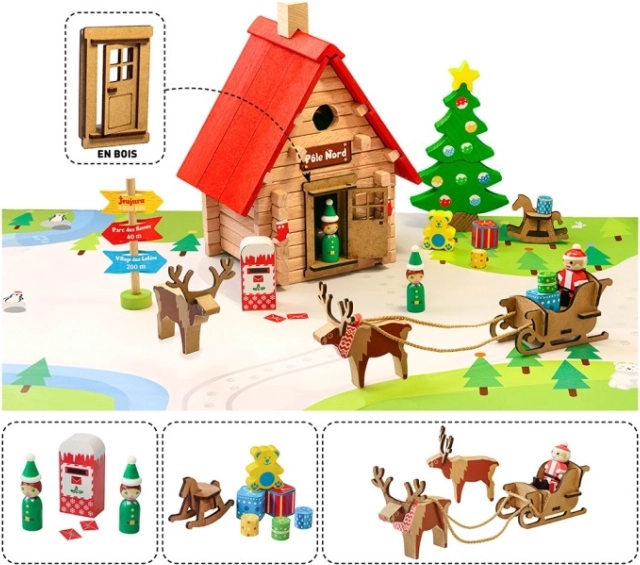 - 90 darab, alaplap, figurák (Mikulás, manók), rénszarvasokkal húzott szán, postaláda, útjelző tábla, ajándékokkal díszített karácsonyfa, útmutató