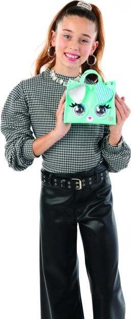 A stílusos PURSE PETS VIPooch menta színű táska feldob bármilyen outfitet, és interaktivitásával szórakoztat. Érintésre reagál, pislant, és 30+ hangot és reakciót kínál. Állítható, akár 100 cm-es pánttal rendelkezik, kézben és crossbody módon is hordható, pop-art szemekkel, ezüstös hatású fülecskékkel és patentos záródással. Remek ajándék 4 éves kortól.