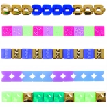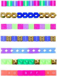 Arany láncok, emotikonok, betűk, csiszolt és csíkos gyöngyök, valamint áttetsző elemek támogatják a kreativitást és az egyedi stílust.