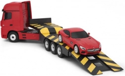 Szállítsd az AMG GT-t a MERCEDES-BENZ ACTROS alacsony rakfelületű pótkocsiján, és élvezd az autentikus rakodást és vezetést. Remek kreatív játékhoz és gyűjtőknek is.