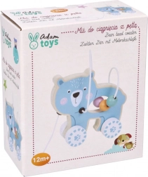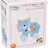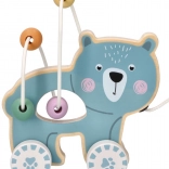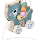 Fa játék kerekekkel és egy macival, amely megragadja a gyermek figyelmét, és ösztönzi a mozgást.