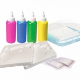 - Művészi felszereltség: A készlet 4 különböző színű, egyenként 30 ml-es zselés üveget, egy tálat, 3 formát és 2 alakstabilizálót tartalmaz.