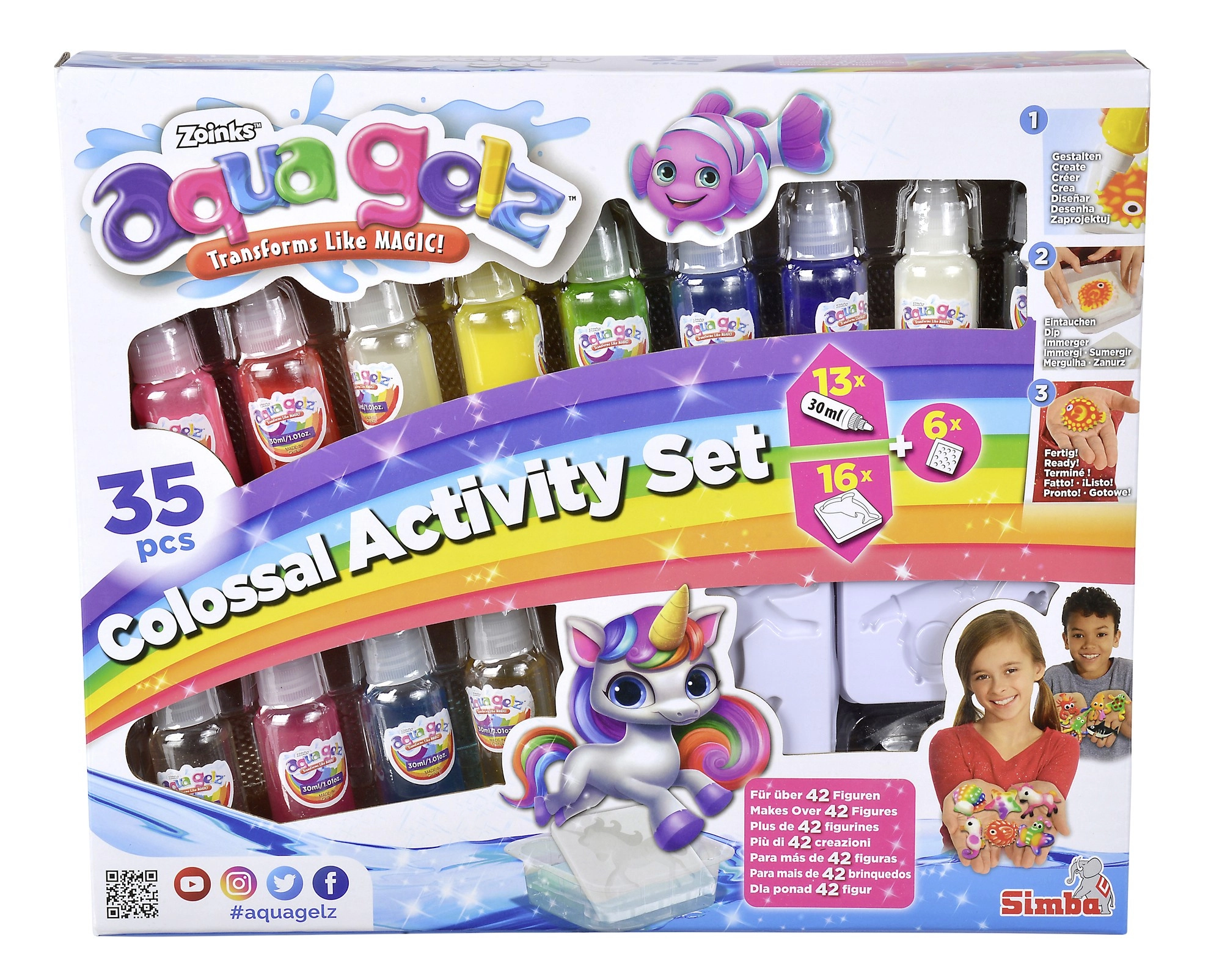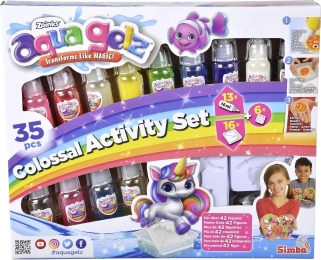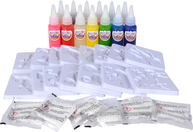 A nagy kreatív Aqua Gelz készlettel a gyerekek könnyedén készíthetnek saját színes figurákat és dekorációkat. Az eljárás egyszerű: keverd el a port egy tál vízben, válassz motívumot, töltsd ki a formát színes gélekkel és óvatosan merítsd bele – néhány másodpercen belül plasztikus 3D figura jön létre, amely magától kiemelkedik a formából.