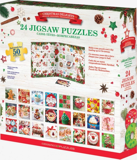 Ez az EUROGRAPHICS adventi naptár minden decemberi napba örömöt visz. A 24 ablak mögött 24 különböző puzzle található, mindegyik 50 darabbal és gyönyörű karácsonyi motívummal. A képek négyzetesek, összeállítva kb. 12,5 × 12,5 cm méretűek. Minden ablakban talál egy mintaképet a könnyebb kirakáshoz, a csomagolás hátoldalán pedig áttekintést az összes motívumról.