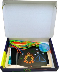 - Teljes felszerelés a dobozban – LED lámpa fluoreszkáló filccel, 16 színes zsinór különböző hosszúságban, tépőzáras tábla, tartó–toll, színes filcformák dobozzal és 4 munkakártya (8 motívum).