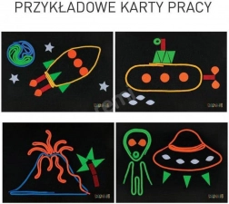 - LED lámpa fluoreszkáló filccel; 16 színes zsinór 5 színben és különböző hosszúságokban; tépőzáras tábla; tartó–toll; színes filcek készlete dobozzal; 4 munkakártya (8 kép)