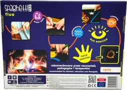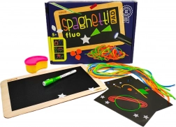 A Spaghetti Fluo készlet a fény és a színek varázslatos játékát hozza el. A rugalmas zsinórok könnyen rögzíthetők a tépőzáras táblához, és pillanatok alatt egyedi motívumok készíthetők, vagy lemásolhatók a munkakártyákon található előképek. A LED lámpával és fluoreszkáló filccel megvilágítva a motívumok látványos fényhatással kelnek életre – ideális alkotáshoz, tanuláshoz és relaxációhoz.