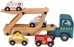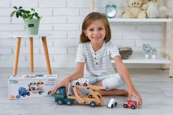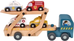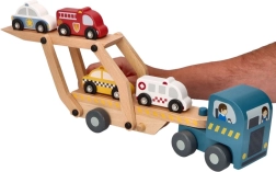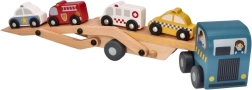 Élvezze az izgalmas városi kalandot ezzel a csodálatos fa autószállító készlettel, amely tele van járművekkel a kreatív játék számára. A mentőautóval, rendőrautóval, tűzoltóautóval és taxival kicsi sofőrje a városi közlekedés mestere lesz!