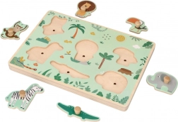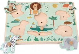 Ezzel a fa hangos puzzle-lal gyermeke felfedezheti a vad afrikai állatok lenyűgöző világát. Minden darab a vágott helyre illeszkedik a táblán, és az adott állat hangját adja ki, ami segít a gyerekeknek nemcsak a megjelenés, hanem a szafari állatok hangjának megjegyzésében is.