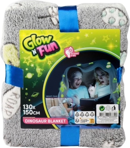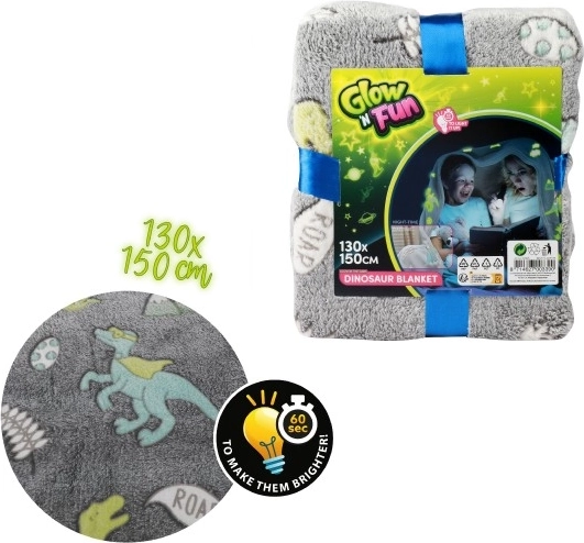 Puha és meleg takaró dinoszaurusz mintával, amely a sötétben valóban világít. Elég rövid ideig fénynek kitenni, és élvezheti a varázslatos éjszakai effektust, a kellemes plüss anyagot és a praktikus 130 × 150 cm-es méretet pihenéshez otthon vagy utazás közben.
