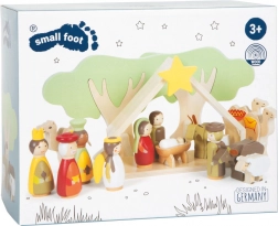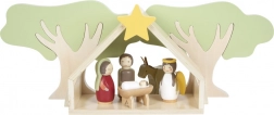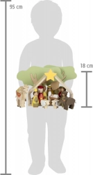 A készlet két fát, csillagos tetőt, három királyt, pásztort, angyalt, Máriát, Józsefet, jászolban fekvő (kivehető) kis Jézust, három tevét, szamarat, bikát és két juhot tartalmaz. A 18 cm magas betlehem minőségi fából készült, ideális családi hagyományokhoz, a gyermeki fantázia fejlesztéséhez és stílusos dekorációként polcra vagy a fa alá.