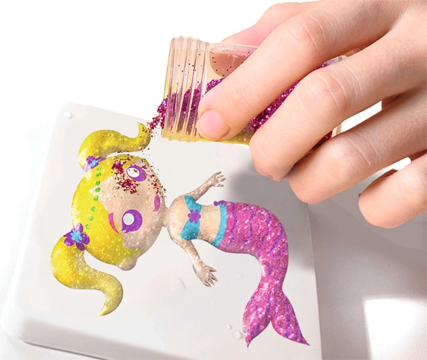 A praktikus csomagolás újra felhasználható edényként is használható vízhez. A csillámok varázslatos csillogást adnak a műveknek, a hat forma pedig rengeteg variációt biztosít. A szett kiváló a kreativitás, a türelem és a színérzék fejlesztésére.