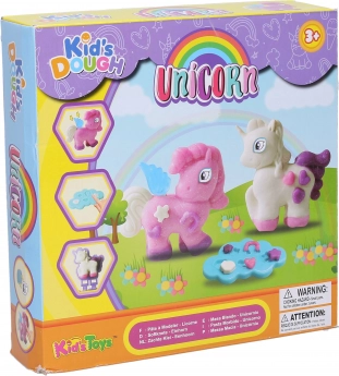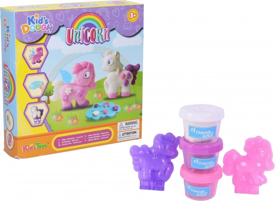 Kreatív gyurmakészlet – unikornis. 3 szín, formák, szárnyak, díszek, olló és spatula. Szórakozás a fantázia és a finommotorika fejlesztésére.