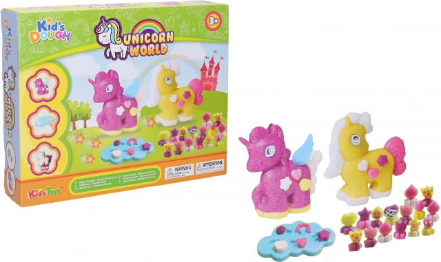 Kreatív gyurmakészlet egyszarvú témában: 4 szín, nyújtóhenger, olló, szárnyak, szemek, díszek és formák. Mesefigurák egyszerű elkészítéséhez.