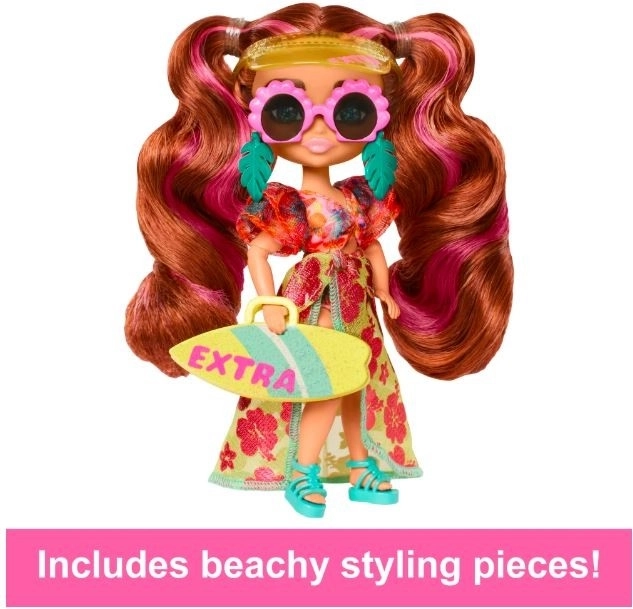 A strandos kiegészítők minden játéknak plusz csavart adnak – rózsaszín kagyló formájú napszemüveg, stílusos kendős hajpánt és sildes sapka illeszkedik a szörfre emlékeztető táskához. A mellékelt állvány lehetővé teszi a baba stabil kiállítását és gyűjtői jelenetek megalkotását.