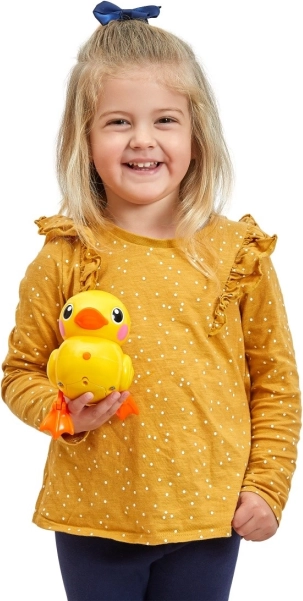 A kiskacsa a szárazon tipeg, a vízben pedig simán siklik – élethű mozgás, amit a gyerekek imádnak.