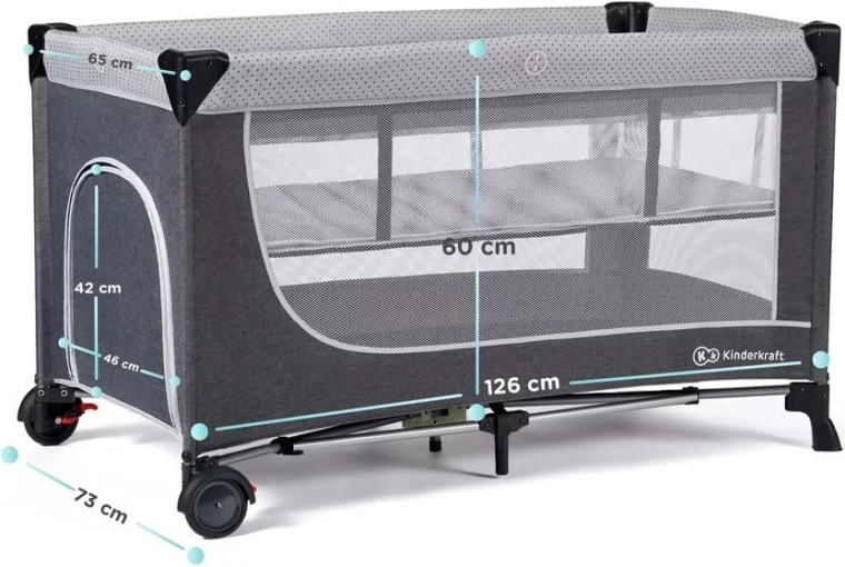 Összecsukva kis méretű (76 × 20 × 20 cm), így KÖNNYEN befér az autód csomagtartójába. A kiságyhoz praktikus hordtáska tartozik.