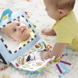 - Szenzoros játék minden oldalon: nagy tükör a száj mozgatásának megfigyeléséhez, zizegő panel, puha, lógó címkék és kontrasztos minták