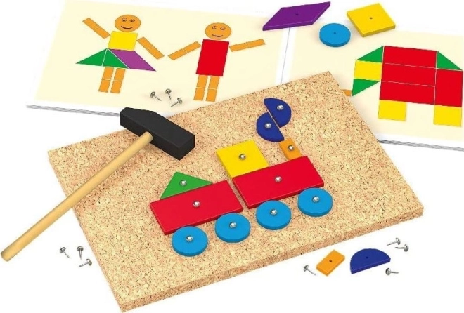 Egyszerű használat – a gyerekek ráhelyezik a formákat, finoman rögzítik szögekkel és kalapáccsal, a kész képet pedig bármikor szétszedhetik és újat készíthetnek. A játék fejleszti a türelmet, a pontosságot és a képzelőerőt.