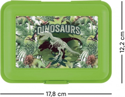 Sváčis doboz BAAGL Dinoszauruszok zöld színben ideális választás gyermekeknek a vonzó dinoszauruszmintájának és a praktikus kialakításának köszönhetően, amely elválasztó rekesszel rendelkezik.