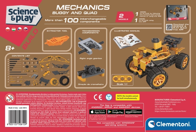 Építsd meg saját terepjáró gépeidet a kreatív STEM készlettel, a CLEMENTONI SCIENCE & PLAY-jel. Több mint 100 elemből összeállíthatsz egy homokfutó buggyt vagy egy quadot, miközben játékos formában megismered a mechanika és a mérnöki tudomány alapelveit. A pontos illesztések, az interaktív 3D-s útmutatók az alkalmazásban és a QR-kód beolvasása után elérhető videó garantálják a könnyű építést és a rengeteg szórakozást.