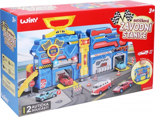 Hordozható versenyállomás 55 × 20 × 25 cm fény- és hangeffektekkel. 2 autó, táblák, matricák és 3× AG13 elem a csomagban. Könnyű összeszerelés.