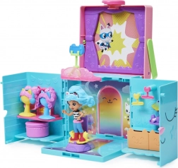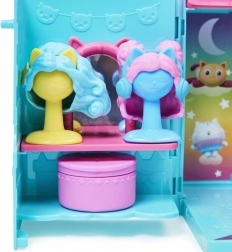 Készítsd fel Gabbyt a sztárfotózásra a tükrös fésülködőasztalnál, három menő parókával és két parókaállvánnyal. A fogasokkal és fiókokkal ellátott szekrényből válassz a két öltözet közül, állítsd a babát a forgó pódiumra, és indulhat a kifutós bemutató. A nap végén mindent visszapakolsz, lezárod, és a praktikus hordfogantyúval magaddal viszed.
