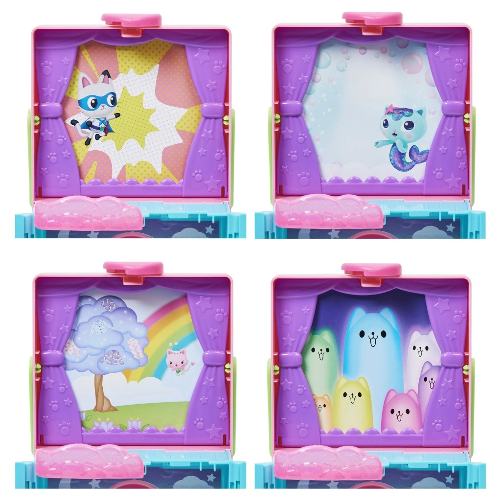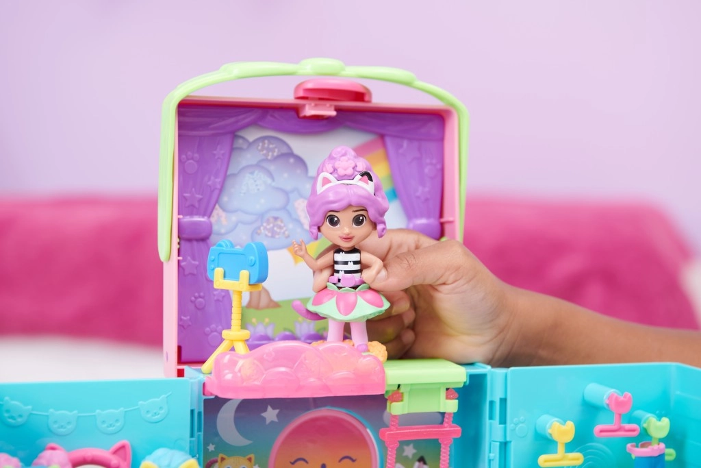 A szett támogatja a kreativitást és a képzelőerőt 3 éves kortól, és kompatibilis a Gabby’s Purrfect Dollhouse házzal a még több játékélményért. A kompakt „cicás” bőrönd tároló rendezőként és hordozható játékszínként is szolgál, bárhol, bármikor.