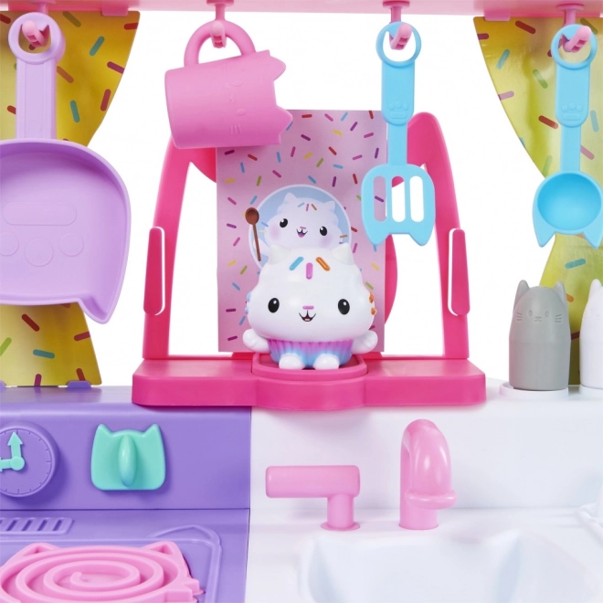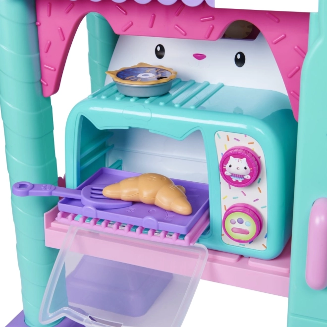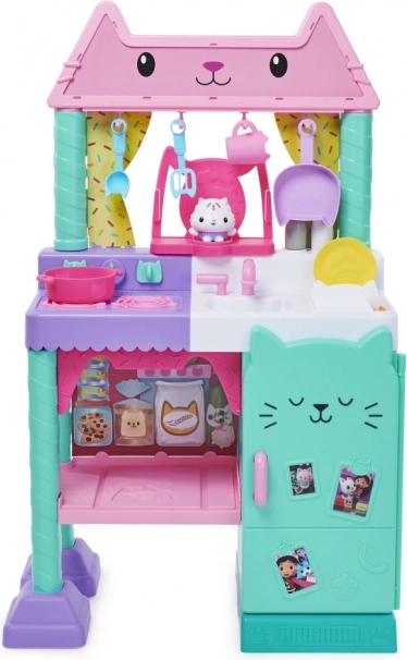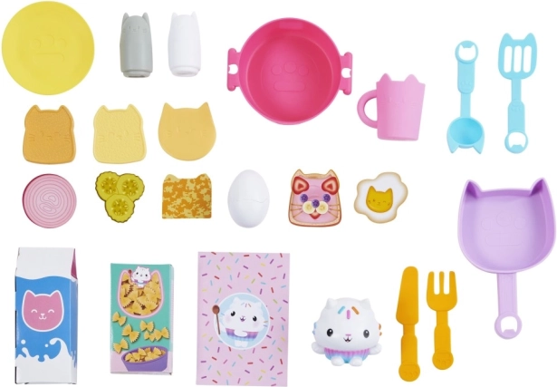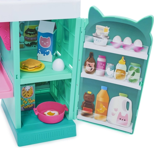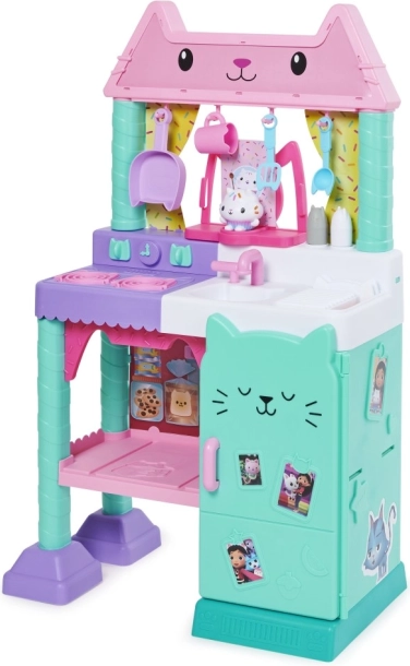 Bemutatjuk a Cakey Cat Kitchen konyhai szettet a Gabin csodaháza világából. Ez a játékkonyha remek kiegészítő a Gabin csodaháza sorozat játékaihoz, lányoknak és fiúknak egyaránt, több mint 20 konyhai kiegészítővel, és több mint 91 cm-es magassággal. Cukimacska konyhája tűzhellyel, csepegtetős mosogatóval, 10 darab konyhai kiegészítővel és edénnyel, az ablak fölötti akasztókkal, 9 darab játék élelmiszerrel, valamint hűtőszekrénnyel rendelkezik Gabin és cicái fotóival; a hűtőben tárolhatod a játék ételeket, kiegészítőket és más játékokat. A gyönyörű konyha egy nagy Cukimacska figurát is tartalmaz speciális állvánnyal, amely az ablakra rögzíthető, hogy Cukimacska figyelhesse a konyhai alkotásaidat. Nyomd meg az állvány gombját, és fordítsd el a tűzhely gombjait, hogy több mint 20 hangot és mondatot, 9 főzési hangeffektet, 3 zeneszámot és 11 Cukimacska-idézetet aktiválj a Netflixen látható népszerű Gabin csodaháza sorozatból. Ha tovább szeretnéd bővíteni a kis konyhát, a tűzhely alatt polc található, amelyet kifejezetten a Bakey with Cakey Oven sütőhöz terveztek (külön kapható). A Cukimacska konyhai játékszett kötelező darab minden Gabin csodaháza rajongónak, akik így eljátszhatják kedvenc főzős jeleneteiket, vagy saját konyhai remekműveket készíthetnek a család és barátok számára.