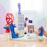 Készülj fel Adventure City megmentésére Libertyvel és a Kölyökcsapattal! Humdinger polgármester és Vee fondorkodnak, és Libertyre és a Kölyökcsapatra vár a feladat, hogy megállítsák őket! Ez a készlet a Mancs őrjárat miniatűr tornyát és Adventure City különböző célpontjait tartalmazza a láthatáron. Rajtad a sor, hogy hűséges kölyöklövőddel megállítsd Vee-t és Humdinger polgármestert, és megmentsd a helyzetet! Kezdd azzal, hogy az egyik Kölyökcsapat-tagot a startplatformra helyezed. Amint készen áll, húzd hátra, forgasd balra és jobbra a kölyökkatapultot, és célozz a 3 előre kijelölt hely egyikére! A kilövő markolatán lévő piros gomb megnyomásával lőj ki egy kölyköt a legmagasabb épület óriási cilinder-ikonjára, mire feltűnik Humdinger polgármester óriási grafikája. Ekkor lődd ki a második kölyköt, hogy kiüsd az útból! Miután az első részt teljesítetted, helyezd a harmadik kölyköt a kilövőbe, célozz a jobb szélső épület tetejére, és próbáld eltalálni, hogy ledöntsd a börtöncella ajtaját az épület előtt, és elfogd Vee-t! Teljesítsd mindhárom részt, és mentsd meg a helyzetet! Szuper szórakozás! Ez a szórakoztató játékkészlet egy óriási csúszdát is tartalmaz rámpával a Mancs őrjárat tornya előtt – pont mint a filmben –, valamint irányítótermet és több játéktért, ahol újrajátszhatod kedvenc jeleneteidet a Mancs őrjárat: A szuperfilm című filmből! A Mancs őrjárat világának játékaival a gyerekek játék közben fejleszthetik képzelőerejüket és finommotorikájukat, miközben átélhetik a film kedvenc jeleneteit! Még izgalmasabb küldetésekhez, amelyeket a Mancs őrjárat sorozat inspirált, gyűjtsd össze a Mancs őrjárat-filmek összes játékát, például a lenyűgöző parancsnoki repülőgép-anyahajót, és a Mancs őrjárat különkiadásainak minden játékát lányoknak és fiúknak, mint a Mighty Pups, Aqua Pups és Big Truck Pups figurák és játékkészletek (mind külön kapható). Élvezd a végtelen kalandokat a Mancs őrjárat: A szuperfilm Liberty és a Kölyökcsapat játékkészletével!