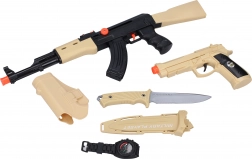 - Komplett szett tematikus játékhoz: gépkarabély, pisztoly tokkal, kés tokkal, óra.
