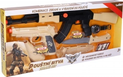 Akciójáték készlet kis katonáknak, amely tartalmaz egy 52 cm-es gépkarabélyt, egy 20 cm-es pisztolyt tokkal, egy 25 cm-es kést tokkal és egy órát. A fegyverek a ravasz meghúzásakor valósághű akusztikus hangokat adnak ki elemek nélkül, a gépkarabély pedig egyszerűen bal oldali karos újratöltéssel működik. Remek készlet katonai témájú szerepjátékokhoz cseh csomagolással.