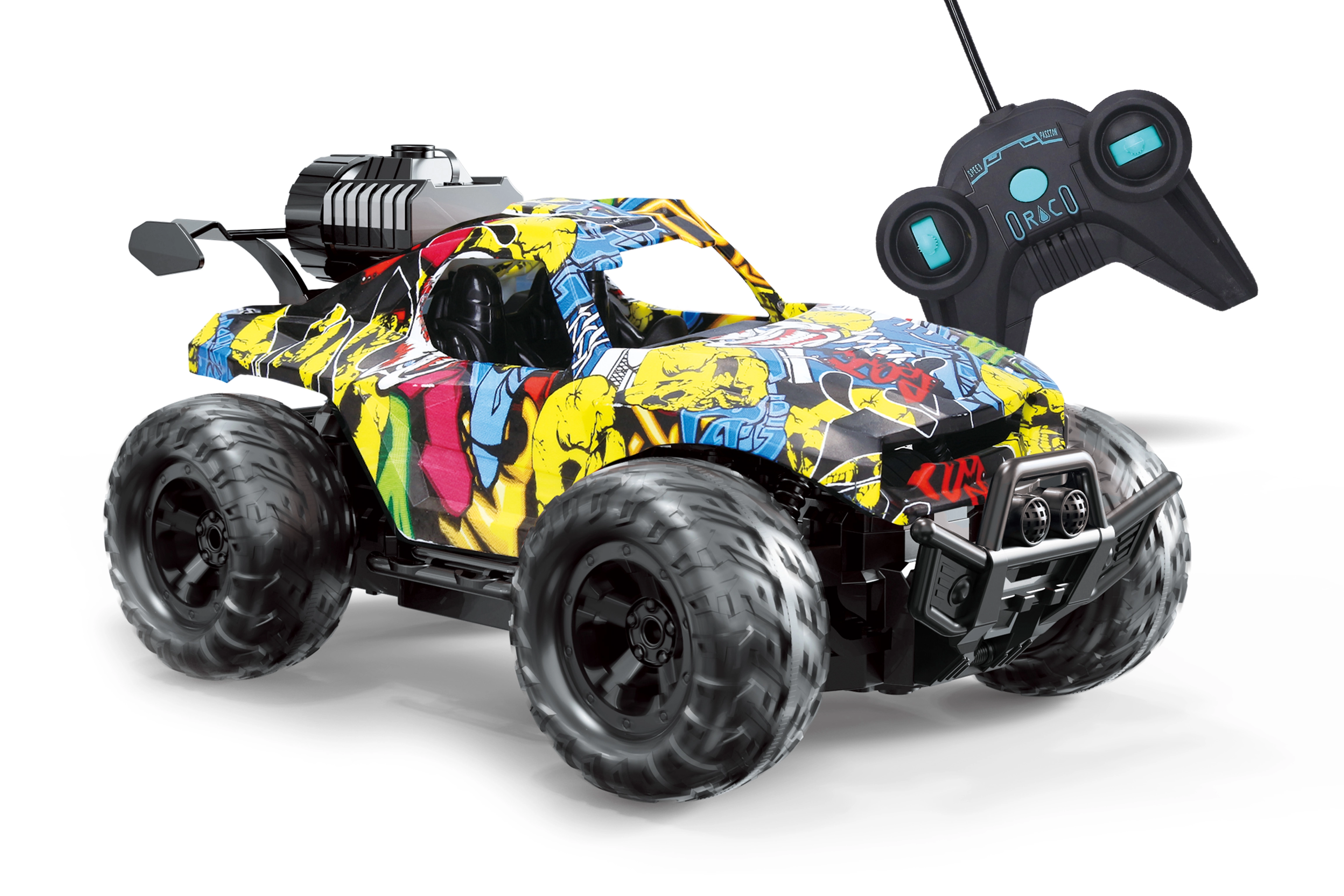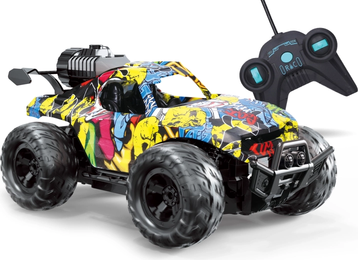 Ez a terepjáró RC autó vagány graffiti stílussal rengeteg szórakozást nyújt a fény- és füst effektusok kombinációjának köszönhetően. A füst az irányítón lévő gombbal aktiválható, és élethű hatást kelt a víztartály egyszerű utántöltésének hála. 24 × 14,5 × 10,6 cm-es méretének köszönhetően könnyen irányítható, kezdőknek és kis versenyzőknek egyaránt megfelelő.