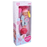 Aranyos baba hanghatásokkal és összecsukható babakocsival, amely minden kis gondoskodót örömmel tölt el. A csomag gazdag tartozékokat tartalmaz a játékhoz – mini babakocsi, tálka evőeszközzel, bilike és cumisüveg. A has megnyomására hanghatások hallhatók. A 3× AG13 elemek a csomagban vannak.