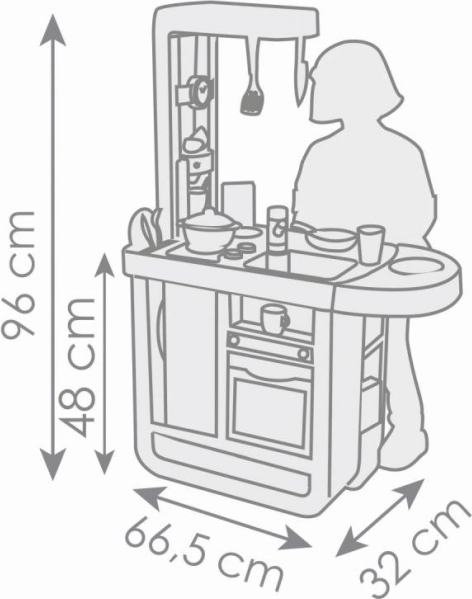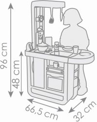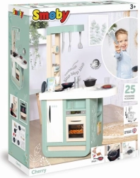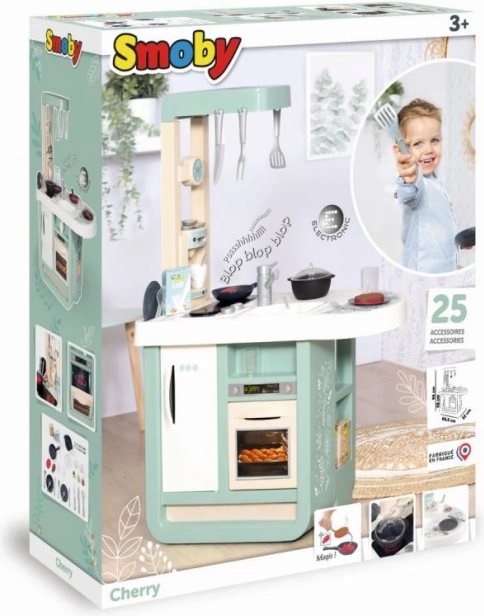 Bon Appetit Cherry konyha egy gyerekkonyha modern dizájnnal és széleskörű tartozékokkal. Szolid pasztellszínezésének köszönhetően ideális gyerekszobába vagy nappaliba. A gyerekek szakácsot játszhatnak forró platnikkal, sütővel és páraelszívóval, amelyek elektronikus hangokat adnak.