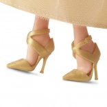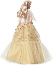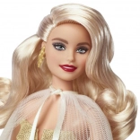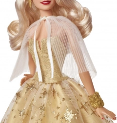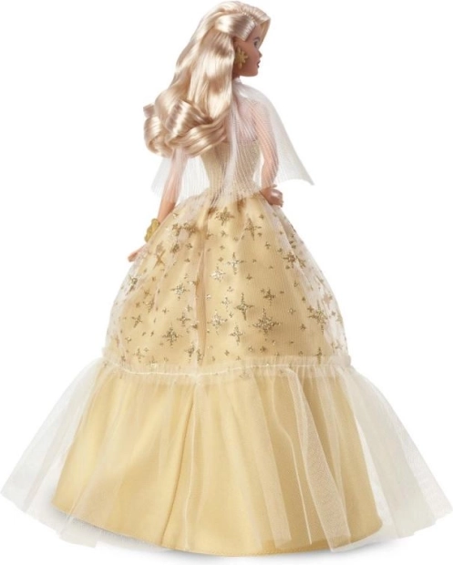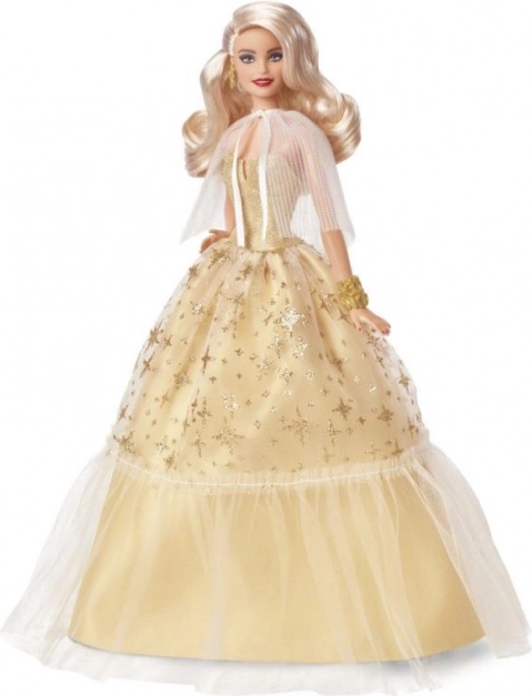 A Barbie Holiday ünnepi kiadás 2023 kézzel készült azoknak, akik ragyogást szeretnének adni gyűjteményüknek, vagy meglepni valakit egy különleges ajándékkal. A babának platinaszőke hajai vannak glamour hullámokkal, pezsgő színű ruhák aranycsillagokkal díszítve és átlátszó pliszírozott kabátja. Minden tökéletesen összeillik arany fülbevalóival és karkötőjével.