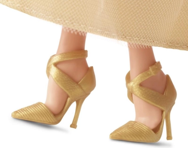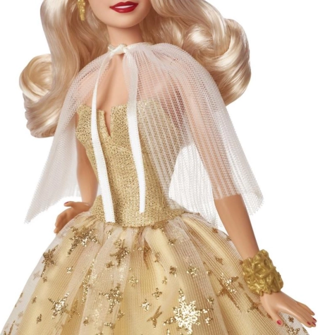 A Barbie pezsgőszínű ruhában van, amelyet aranycsillagok borítanak, megtestesítve az ünnepi hangulat varázsát.