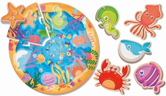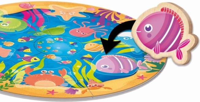 Kerek fa puzzle készült a tapintás és logikai képességek fejlesztésére. Tökéletes választás 1 éves kortól.