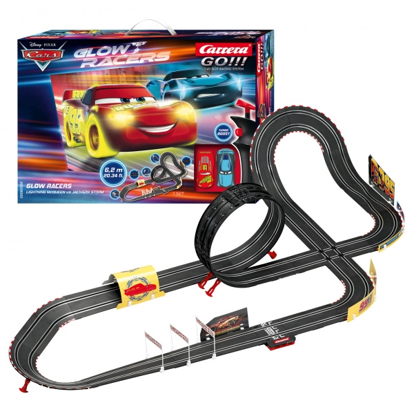 Családi szórakozás és igazi verseny adrenalin – ez a CARRERA GO Disney-Pixar Verdák kiadásban. Két részletgazdag modell, Villám McQueen és Jackson Storm GLOW Racer változatban ragyog a kihívásokkal teli pályán: hurkot, függőleges falat és döntött kanyarokat is magabiztosan vesznek a magnak és a dupla érintkezőkeféknek köszönhetően. A villámrajthoz mindkét vezérlőn ott a Turbo funkció.