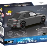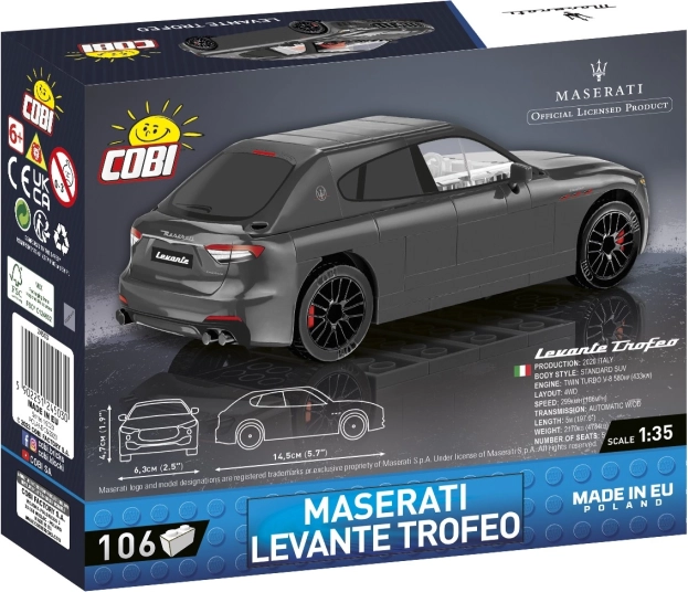 A COBI építőkészlet a Maserati világhírű olasz autógyártó licencére épült 1:35 méretarányú modelleként mutatja be a Maserati Levante Trofeo-t. Ez a modell nagyszerű ajándék minden autók iránt rajongónak. Különlegesen tervezett elemei hűen utánozzák a karosszéria formáit, és tartós, színes nyomtatása biztosítja, hogy a blokkokból készült járművek valóban kis műalkotásokként néznek ki.