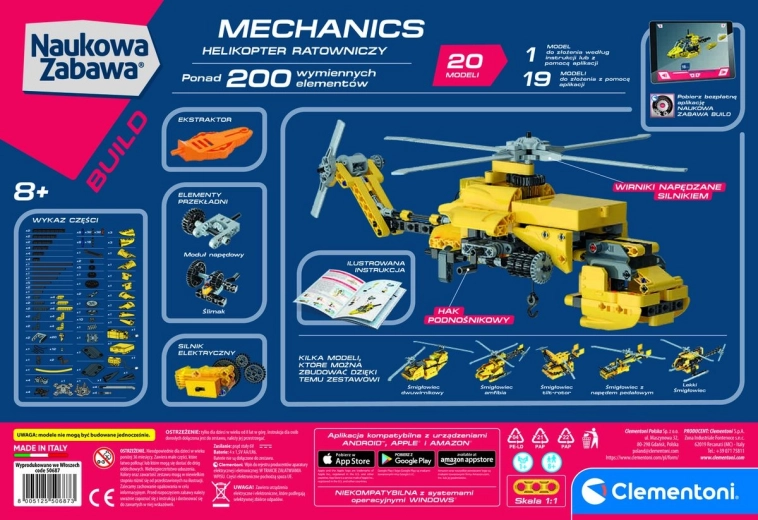 A csomag része a ingyenes alkalmazás interaktív 3D útmutatókkal, amelyek lépésről lépésre vezetnek az építés során. Akár 10 különböző modellt is megépíthetsz, és 10 műszaki megoldást próbálhatsz ki, a rotor mechanizmusoktól a működő csörlőn és a kormánylapokon át. A minőségi kivitel és az olasz gyártás hosszú élettartamot és pontos illeszkedésű alkatrészeket garantál.